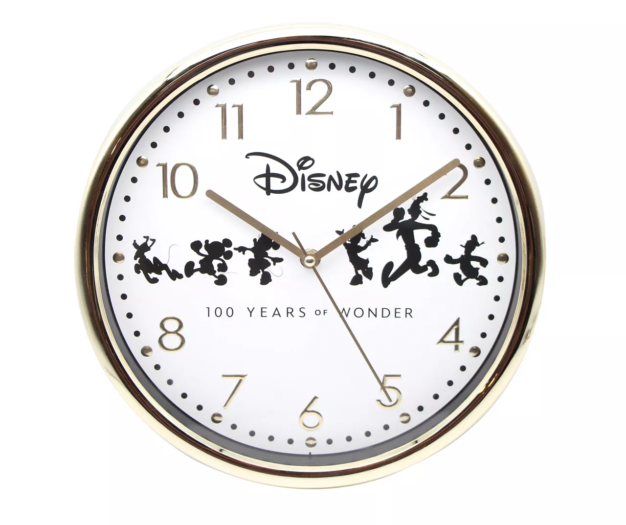 Celebrate Disney’s 100th anniversary in a timely manner with this elegant wall clock featuring a marching parade of iconic Disney character silhouettes. Gold embellishments on the numbers, hands and border bring a sophisticated gleam to this decorative pick.
