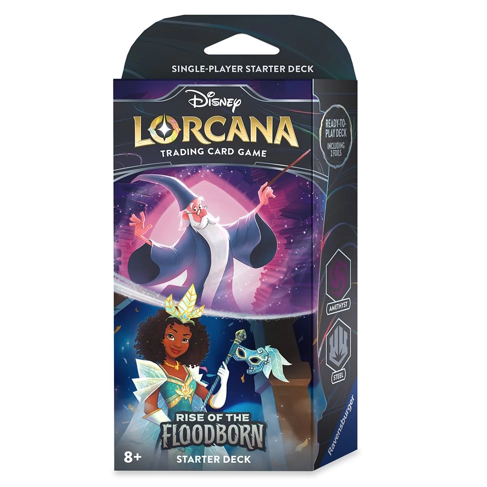 Ready, set, play! Open up this Rise of the Floodborn single-player starter deck and you have everything you need to begin playing Disney Lorcana Trading Card Game by Ravensburger. The deck has 60 cards, including one foil card each of Merlin and Tiana, plus 11 game tokens and a rulebook. Also included is a booster pack with 12 additional game cards. Play with friends with their own decks and begin an amazing adventure you create. Get ready to wield some magic!